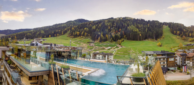 Der Wechsel von wohltuenden Temperaturen, kuschelige Rückzugsplätze, das Knistern im Kamin, stimmungsvolle Licht- und Soundeffekte, erdige Farben und natürliche Materialien lassen Geborgenheit rundum spüren. Dank der großen Fensterflächen fühlt es sich an, als wäre man inmitten der wunderbaren Natur. „Der Pool in dieser Höhe und Größe ist einzigartig. Er bietet viel Platz zum Schwimmen und einen herrlichen Blick auf den Ort und die beeindruckenden Leoganger Steinberge. Die Sicht von oben – auch aus den Saunen – bringt Abstand zum Alltag“, schwärmt der Hotelier.