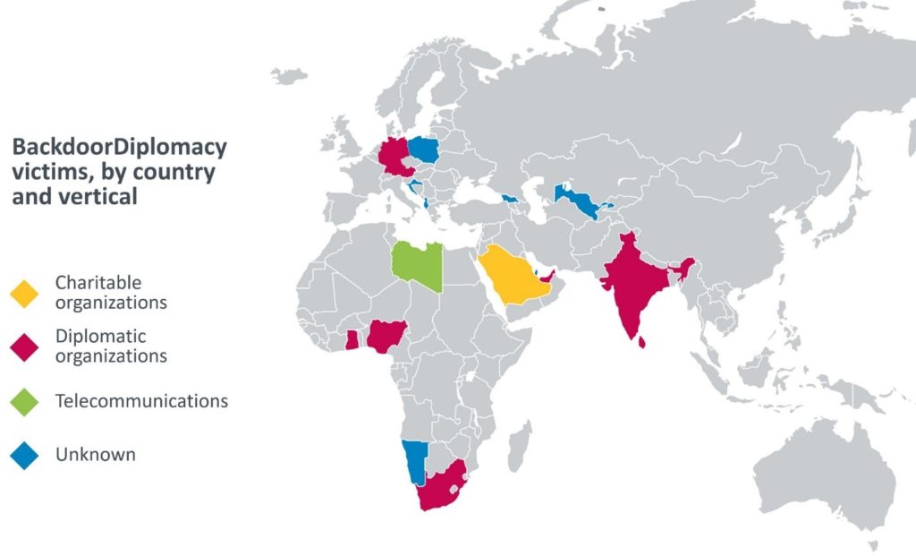 Opfer von BackdoorDiplomacy waren Außenministerien mehrerer afrikanischer Länder ebenso Einrichtungen in Europa, dem Nahen Osten und Asien. Weitere Ziele sind Telekommunikationsunternehmen und mindestens eine Wohltätigkeitsorganisation. In jedem dieser Fälle setzten die Angreifer ähnliche Taktiken, Techniken und Prozeduren (TTPs) ein. Sie modifizierten jedoch die verwendeten Tools, sogar innerhalb enger geografischer Regionen, was die Verfolgung der Gruppe wahrscheinlich erschweren sollte.